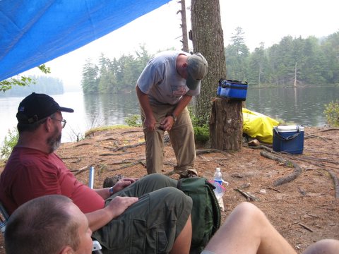 We were on the water before noon and with Skip setting a racing pace we were at campsite 35 in just a little over an hour. It started to splat rain as we came across the lake. Once at the campsite we quickly set up tents and a large rainfly. With the impending rain and dire forecast we pitched tarps over our tents for insurance.