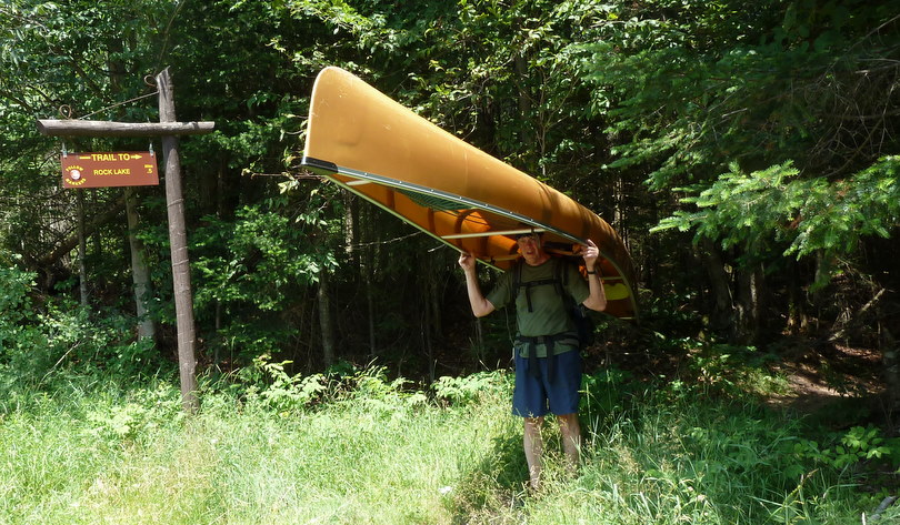 As the trip wore on we consumed drinks and food and packed more efficiently such that not everyone had to double portage. Usually everyone made one carry, including Eric who carried his knapsack and three canoe paddles, and three people returned for a 2nd load. We took my kevlar MN II (43 lbs) and fiberglass Jensen (54 lbs). I fit a clamp-on portage yoke onto the Jensen, but it was never really comfortable. We all took turns carrying this boat, but Bob & Skip carried the Jensen the most. Below Bob demonstrates his technique as I follow with a 2nd load.